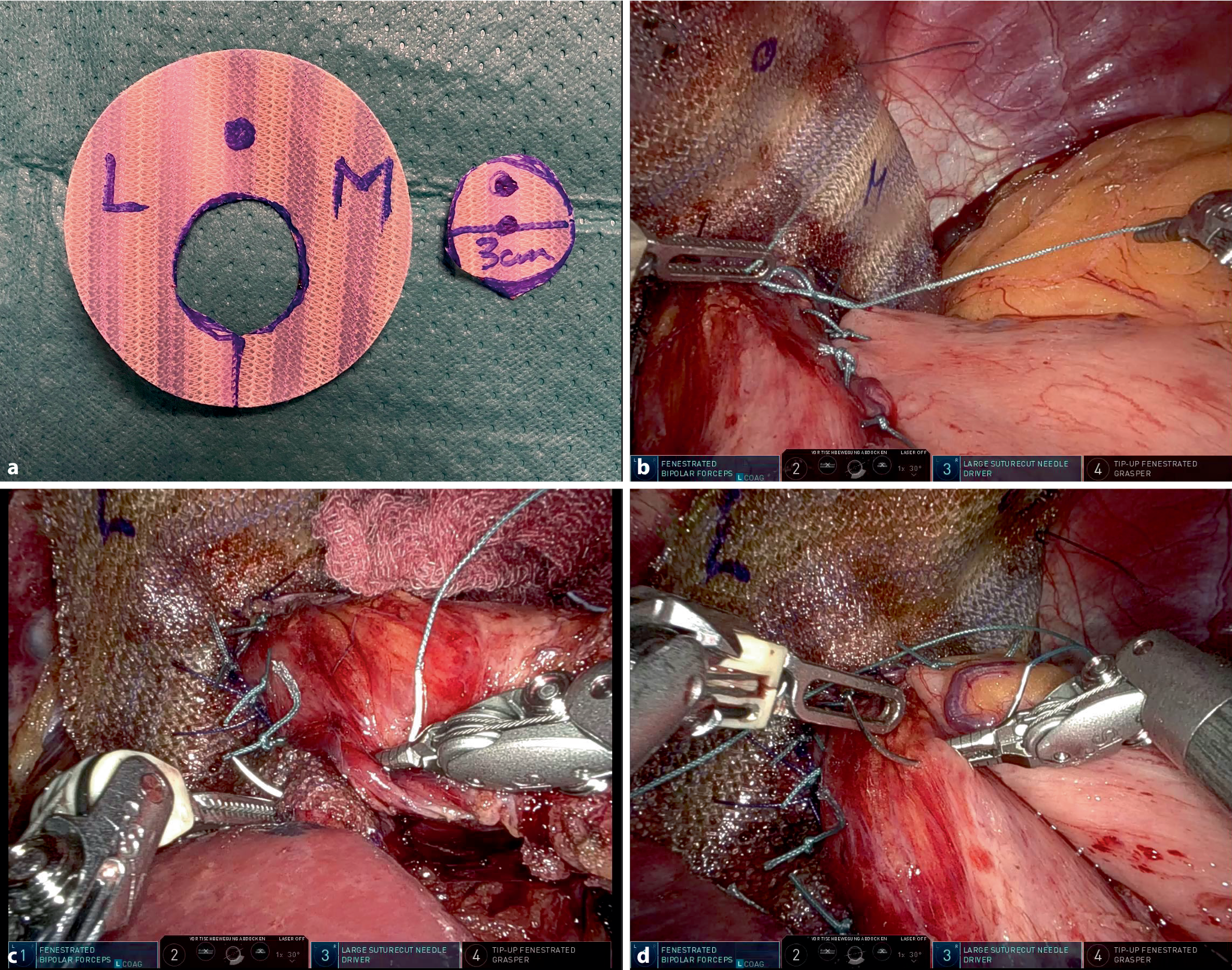 Mesh augmentation and “anatomical reconstruction” of the esophagogastric junction (EGJ). a Keyhole-shaped biosynthetic absorbable mesh (Phasix™, BD, Franklin Lakes, New Jersey, USA). The low placement of the recess for esophageal passage ensures broader anterior hiatal mesh coverage. L liver, M Milz (German for spleen), and ventral dot for proper orientation. b His-angle reconstruction following the Lortat–Jacob technique. c Anchoring the esophagus and EGJ to the hiatal crura (modified Hill gastropexy). d 90–180° anterior partial fundoplication