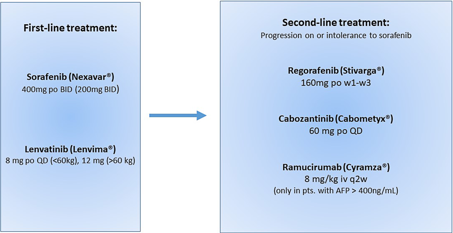 Hepatocellular carcinoma (HCC) accounts for the majority of primary liver cancers. Worldwide, liver cancers are the fourth most common cause of cancer-related death and rank sixth in terms of incident cases [1]. Whereas in Asia the global burden of HCC is declining, it is still increasing in the US and Europe [2]. Liver cancer is the second most lethal tumor. In the majority of cases, HCCs occur in patients with advanced-stage chronic (cirrhotic) liver disease, mostly as a result of hepatitis B (HBV) and C virus (HCV) infection and alcohol abuse [3, 4]. Due to the universal availability of HBV vaccination and the wide implementation of direct antiviral therapy for HCV, virus-related HCCs will decrease, whereas HCC due to non-alcoholic fatty liver disease (NAFLD) together with metabolic syndrome will become a leading cause of HCC in western countries. Despite the fact that surveillance programs lead to early detection in up to 51.6% of patients, at a point when curative treatment options are applicable, more than half of patients present with advanced-stage tumor and ultimately receive palliative therapies [5]. According to several international guidelines, systemic therapies are recommended for patients with advanced disease (Barcelona Clinic Liver Cancer [BCLC] stage C) or who have intermediate-stage disease (BCLC-B) and progression with transarterial therapies [6, 7].
