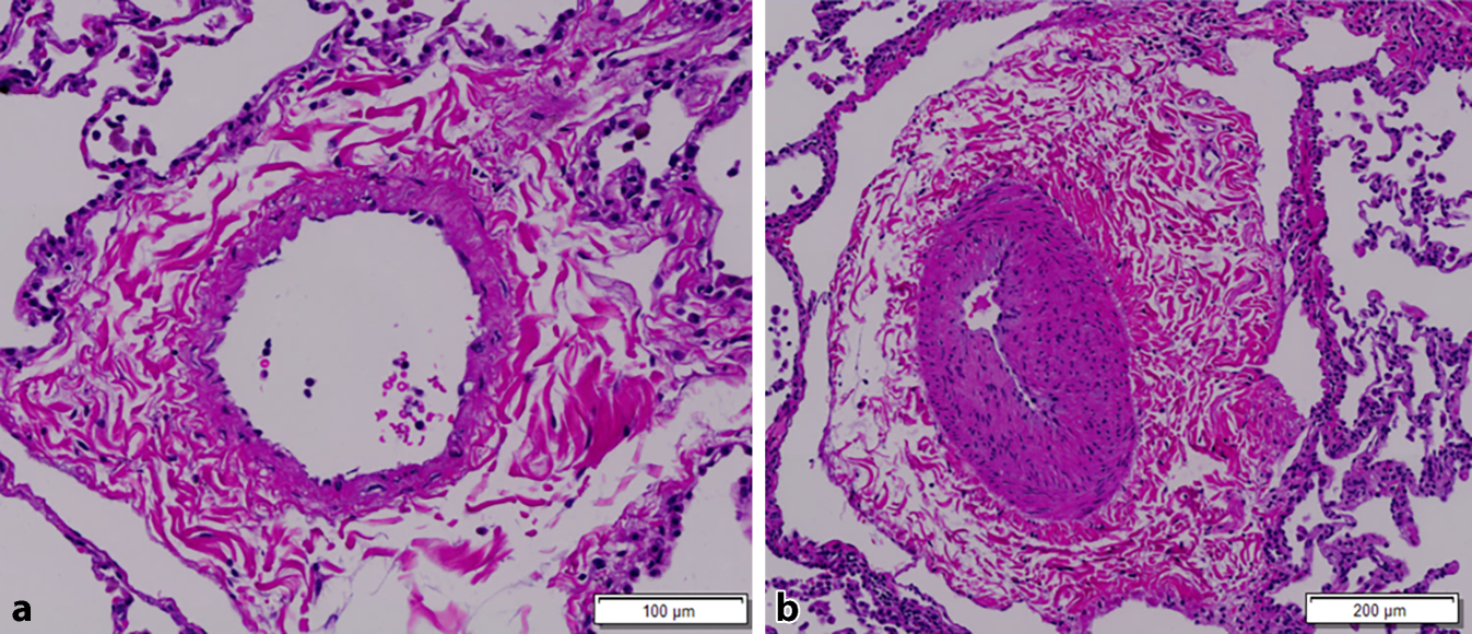 Die häufigste PH-Form bei SSc ist die pulmonal-arterielle Hypertonie (PAH), bei der primär die Lungengefäße von der Erkrankung betroffen sind (Gruppe-1-PH). Hier kommt es zu einem unumkehrbaren Gefäß-Remodeling der Pulmonalarterien (Abb. 1) und dadurch zu einer Erhöhung des pulmonalen Gefäßwiderstands auf > 2 „wood units“, die in weiterer Folge zu einer Nachlasterhöhung des rechten Ventrikels und unbehandelt zu Rechtsherzversagen und Tod führt. Für diese Gruppe der PH sind die klassischen bekannten PAH-Medikamente zugelassen [2].