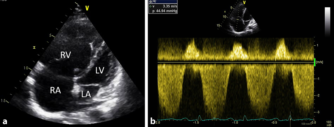 Der Goldstandard für die Diagnose einer PH, egal welcher Ursache, ist die invasive Rechtsherzkatheteruntersuchung. Wichtige Hinweise auf eine PH liefern im klinischen Alltag Routineuntersuchungen wie die Auskultation (betonter zweiter Herzton, Pansystolikum aufgrund der Trikuspidalklappeninsuffizienz), das EKG (Rechtstyp, rechtsventrikulärer „strain“ V2–V4, [in]kompletter Rechtsschenkelblock), die Röntgenuntersuchung des Thorax (Dilatation des Truncus pulmonalis, Rechtsherzhypertrophie) und die Laboruntersuchung (erhöhtes NT-pro-BNP). Die Lungenfunktion zeigt bei PH, wenn nicht gleichzeitig eine Lungenerkrankung vorliegt, einen unauffälligen Befund (evtl. leichtgradige Restriktion). Die DLCO ist jedoch meist leicht- bis mittelgradig reduziert, was oft mit einer respiratorischen Partialinsuffizienz einhergeht (pO2 vermindert, pCO2 normal oder ggf. durch Hyperventilation vermindert). Das wichtigste nichtinvasive diagnostische Tool stellt die Rechtsherzechokardiographie mit Abschätzung des systolischen Pulmonalarteriendrucks (sPAP) und der rechtsventrikulären Funktion und Dimensionen des rechten Herzens dar (Abb. 2). Ist das Trikuspidalinsuffizienzsignal > 3,4 m/s, ist die Wahrscheinlichkeit des Vorliegens einer PH hoch. Aufgrund des erhöhten Risikos, eine PH zu entwickeln, sollten SSc-PatientInnen einmal jährlich auf das Vorliegen einer PH mittels Echokardiographie gescreent werden [2].