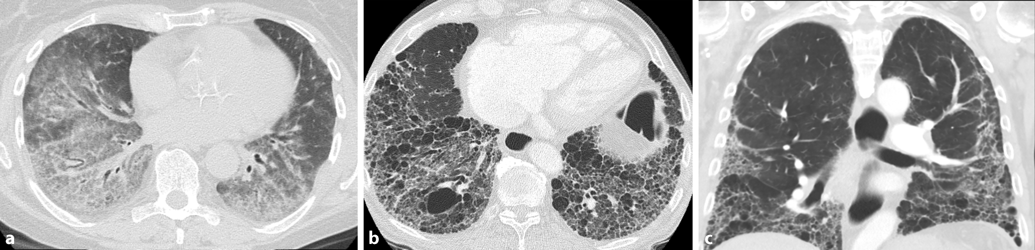 SSc-typische Veränderungen in der HRCT. a NSIP-Muster mit überwiegend Milchglasinfiltraten. b UIP-Muster ohne Milchglasinfiltrate, aber mit ausgeprägtem „honeycombing“ und Traktionsbronchiektasen. c Ebenfalls UIP-Muster, aber hier gut dargestellt die basale Betonung der Lungenveränderungen bei der SSc-ILD