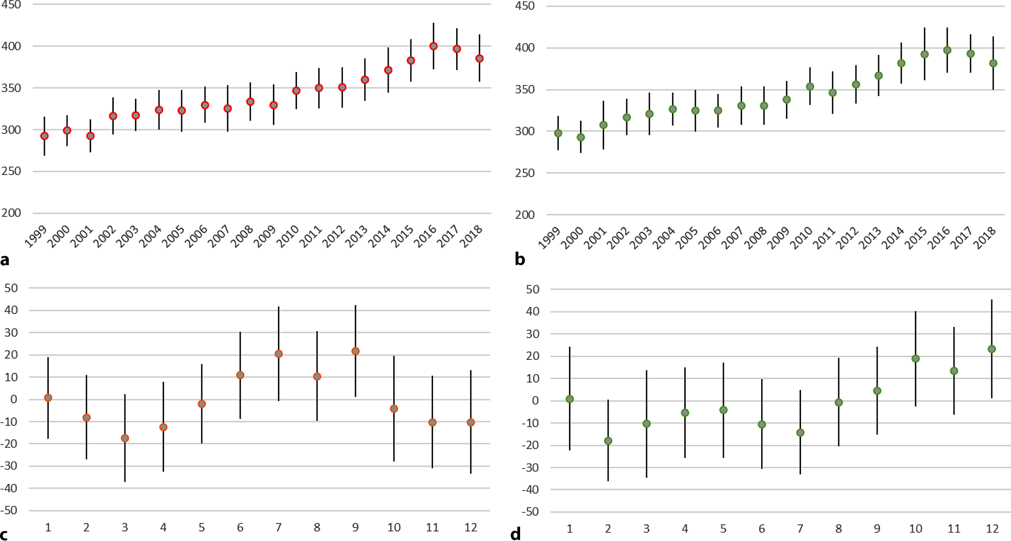 Number of weekly births (a) and conceptions (b) per year, mean ± standard deviation. For depicting the seasonal variation, the difference between weekly numbers and the annual average was calculated and that difference was presented per month for births (c) and conceptions (d)