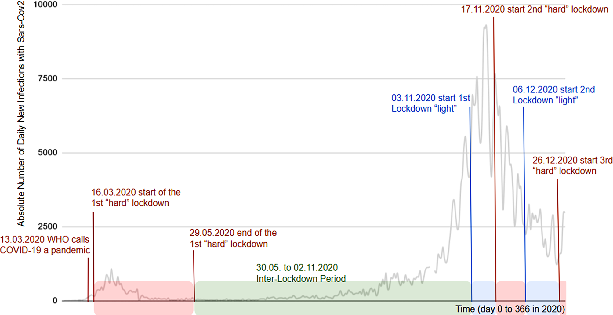 Daily new infections with COVID-19 (Corona-Virus-Disease 19) in Austria as reported by the Federal Interior Ministry and documented by Dong et al. (2020) [9]. Superimposed are in red the hard lockdown periods, in blue the lockdown light phases and in green the inter-lockdown period with close to no restrictions work-wise