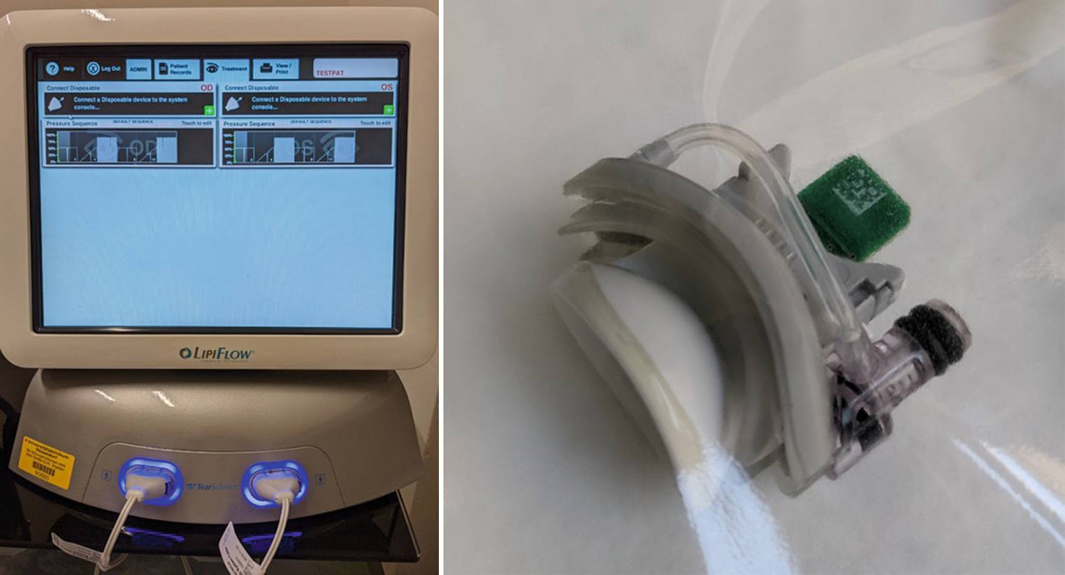 LipiFlow®-System (Firma TearScience®, Morrisville, NC, USA). zur Erwärmung und Massage der Lider in einer 12-minütigen Behandlung. Bildschirminterface und steril verpackter Einmalapplikator. Eine technisch assistierte Lidkantenmassage (Druck und Wärme) bei Meibom-Drüsen-Dysfunktion