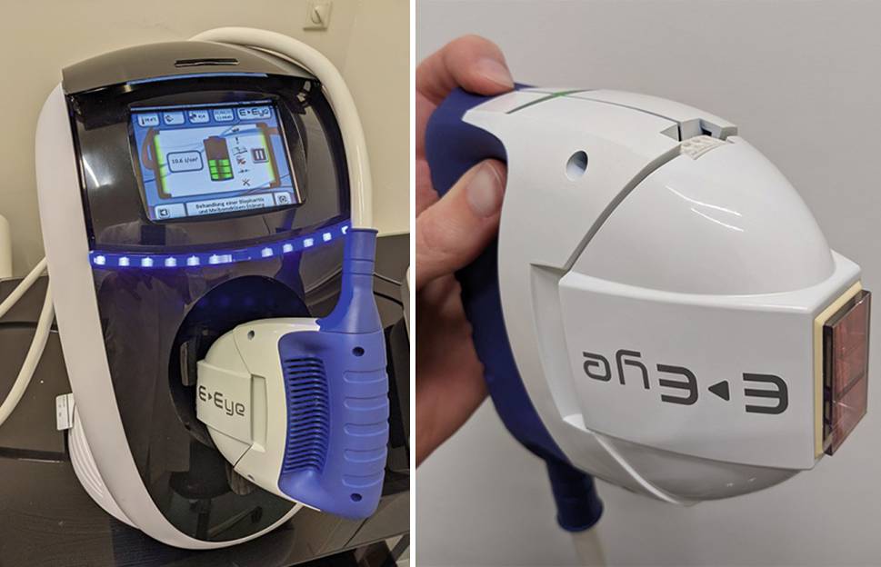 E‑Eye „Intense pulsed light“ (Firma E‑Swin, Houdan, Frankreich) IPL-Gerät mit Handapplikator. Xenon Blitzlicht emittiert Licht im Wellenlängenbereich 500 bis 1200 nm. Periokuläre Anwendung zur Stimulation bei Meibom-Drüsen-Dysfunktion