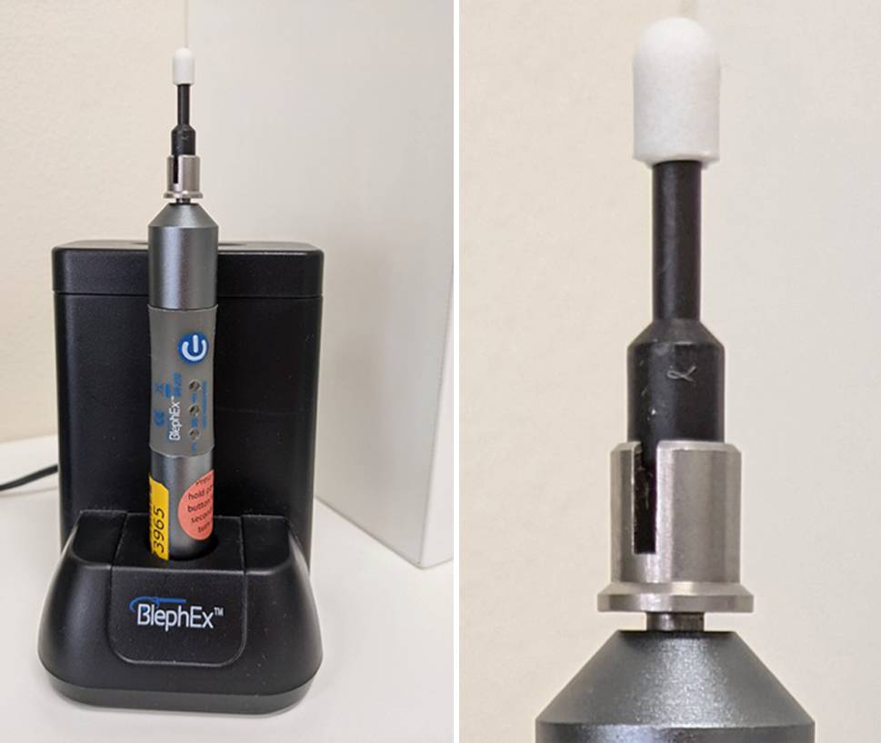 Blephex™ (Firma BlephEx® LLC., Franklin, TN, USA) zur Entfernung von keratinisiertem Material. Eine mechanische Reinigung der Lidkanten mit rotierendem Bürstenkopf und Reinigungsschaum bei Meibom-Drüsen-Obstruktion