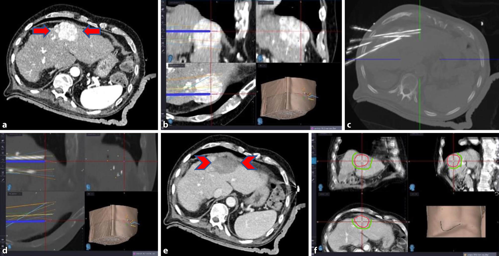 Stereotactic thermal ablation (SRFA) in a 76-year-old man with history of fatty liver disease and liver cirrhosis and hepatocellular carcinoma (HCC). a Contrast-enhanced CT depicting a 52 mm HCC in segment IV (arrows). b Planning of multiple needle trajectories. c Maximum intensity projection (MIP) of native control CT with coaxial needles in place. d Image fusion of needle control CT with planning CT (with the planned trajectories) confirms precise needle placement. e Intraoperative contrast-enhanced CT immediately after radiofrequency ablation (RFA) showing devascularized ablation zone (arrowheads). Image f is showing the control CT with the ablation necrosis at the end of the procedure, which is fused to the arterial phase planning CT in imageaI to prove overlap of the tumor (red line) and the ablation zone (hypodenserim), confirming the ablation margin (green line)