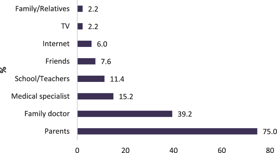 Most adults named the family doctor (44.7%) as their source of information on vaccination. Among children, 75.0% named their parents as their source of information about vaccination. Figs. 2 and 3 show detailed results.