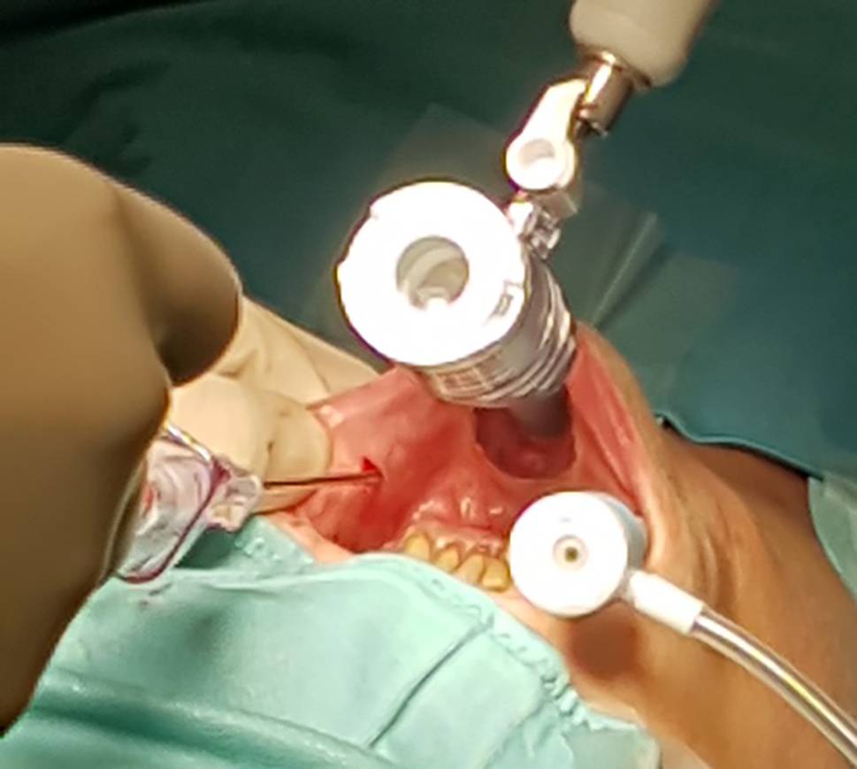 Transoral surgery was performed with either three 5‑mm trocars to reduce tissue trauma or one 10–12-mm midline trocar and two lateral 5‑mm trocars.