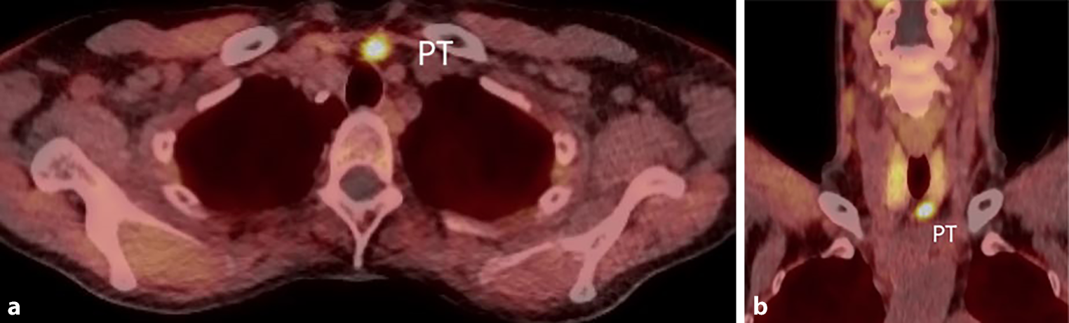 a, b18F‑choline positron-emission tomography scan of a left lower parathyroid adenoma in a 65-year-old female with primary hyperparathyroidism. PT Parathyroid adenoma