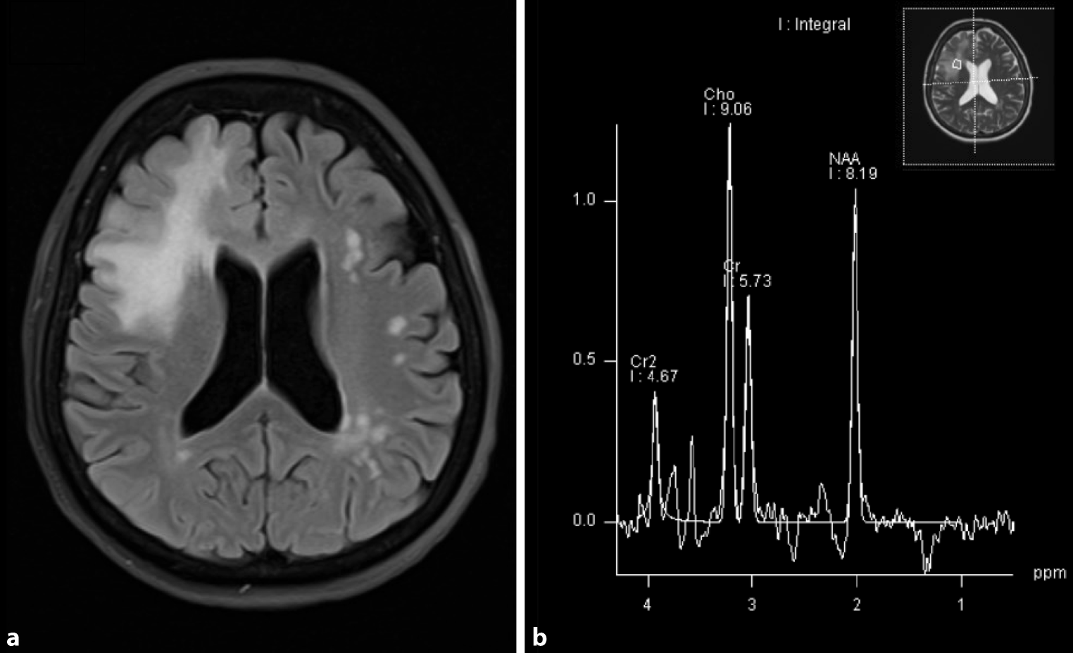 Tumefactive, demyelinating central nervous system lesion in MRI and MR spectroscopy transverse fluid-attenuated inversion recovery (FLAIR) image. Image (a) shows extensive T2 hyperintensity of the right frontal lobe with a maximum range of 6.2 cm. No associated contrast enhancement or diffusion restriction could be detected (disease exacerbation > 12 months before current MRI). Image (b) shows MR spectroscopy using chemical shift imaging with an increase of choline (Cho), normal N‑acetyl aspartate (NAA), and a characteristic negative double peak at 1.3 ppm, representing lactate. The marked increase of choline accompanied by the lactate peak is highly suggestive of a low-florid demyelinating process