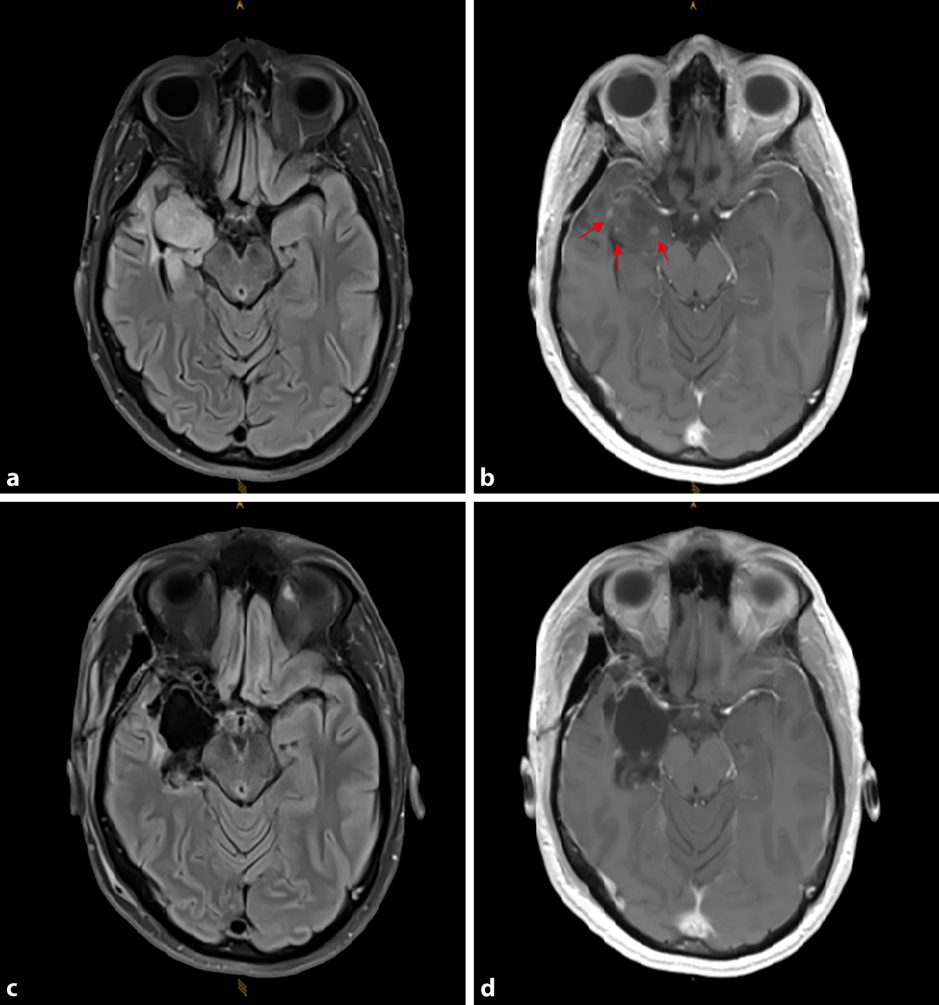 Im November 2021 berichtete der Patient über eine neuerliche Anfallszunahme mit nahezu täglichem Auftreten seit etwa 3 Monaten. Bildgebend zeigte sich ein stabiler Befund ohne Zeichen eines Tumorwachstums. Eine Add-on-Therapie mit Lacosamid wurde gestartet. Zusätzlich wurde, auch wenn sich bildgebend kein Progress zeigte, bei vorliegender klinischer Verschlechterung eine Chemotherapie mit Temozolomid eingeleitet. Ziel der Tumortherapie war, die Anfallsproblematik positiv zu beeinflussen. Initial zeigte sich unter Chemotherapie ein Rückgang der Anfallsfrequenz, nach 4 Zyklen aber dann wieder eine Verschlechterung. Auch bildgebend konnte dann zu diesem Zeitpunkt unter Therapie ein progredientes Tumorwachstum, vor allem rechts temporomesial im Bereich der Amygdala beziehungsweise um dieses Areal und auch entlang des Hippocampus festgestellt werden. Als möglicher bildgebender Hinweis einer Malignisierung des Tumors fanden sich neue punktförmige Kontrastmittelanreicherungen im Bereich der Amygdala (Abb. 1a, b). Daraufhin wurde bei klinischem und bildgebendem Progress eine Re-OP empfohlen. Präoperativ kam es zu einer laufenden Verschlechterung der Anfallssituation mit bis zu 20 Anfällen pro Tag. Medikamentös wurde zusätzlich eine Therapie mit Clobazam etabliert. Die OP wurde priorisiert und es erfolgte eine Rezidiv-Tumorexstirpation mit Entfernung der Tumoranteile rechts temporomesial (Abb. 1c, d). Resttumoranteile im Bereich der Sehbahn rechts wurden bewusst aus funktionellen Gründen belassen.