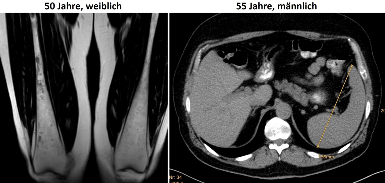 Knochenmarkbeteiligung bei M. Gaucher bei einer 50-jährigen Patientin und milde Splenomegalie (15,6 cm) bei einem 55-jährigen Patienten: typische Auftreibung der Diaphysen der Femora im Sinne der sog. Erlenmeyerkolbendeformität, die analog zur Entstehung der Hepatosplenomegalie auf der Speicherung von Glukosylzeramid in Makrophagen beruht