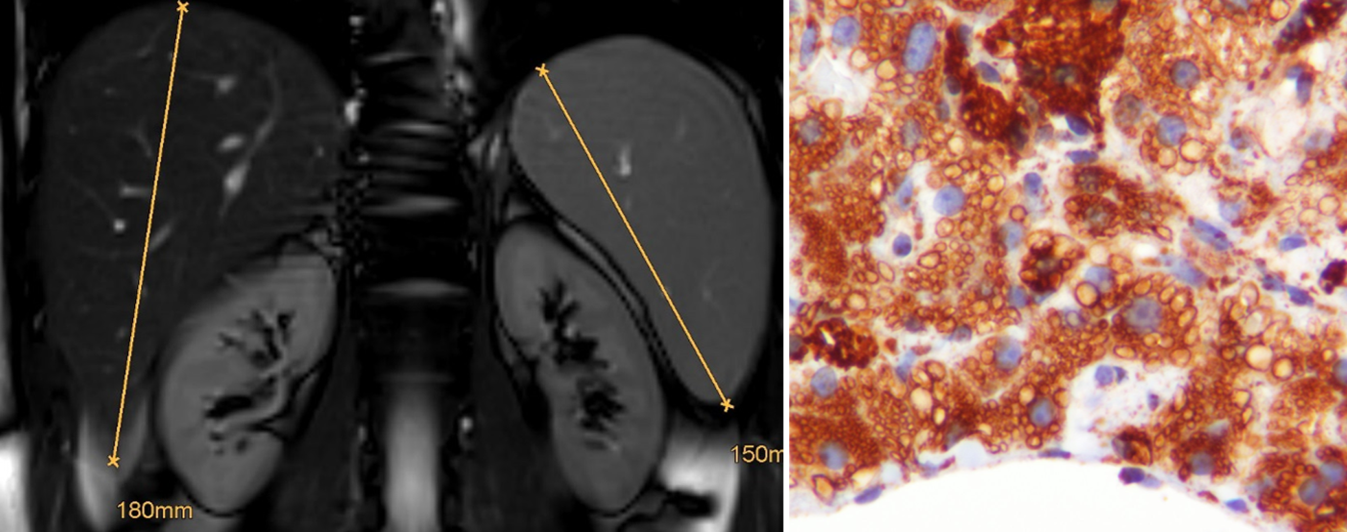 Befund eines 26-jährigen beschwerdefreien Patienten mit Hepatosplenomegalie mit Mangel an lysosomaler saurer Lipase („lysosomal acid lipase deficiency“, LAL-D) in der Magnetresonanztomographie (links) sowie in der Leberbiopsie mit dem Lysosomenmarker Cathepsin D (rechts), der die generalisierte lysosomale Speicherung von Cholesterinestern und Triglyzeriden zur Darstellung bringt