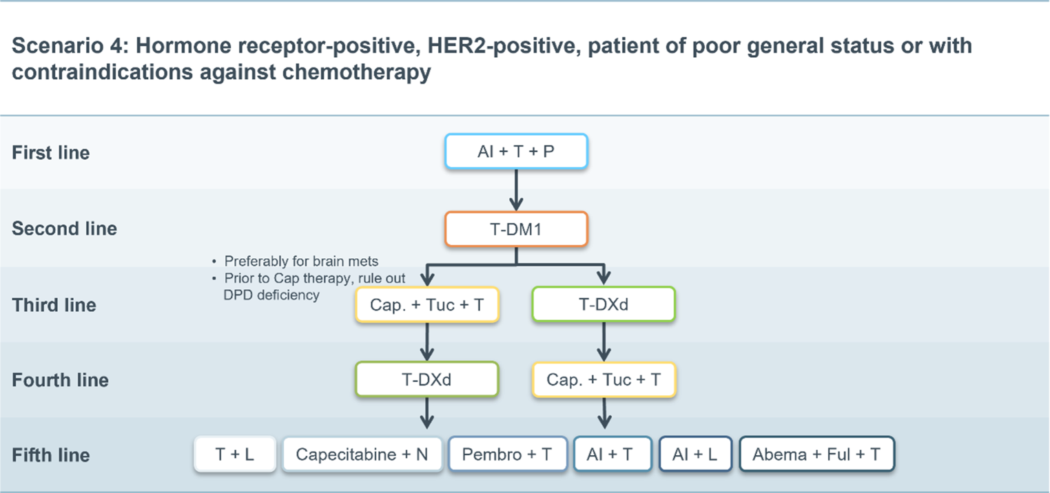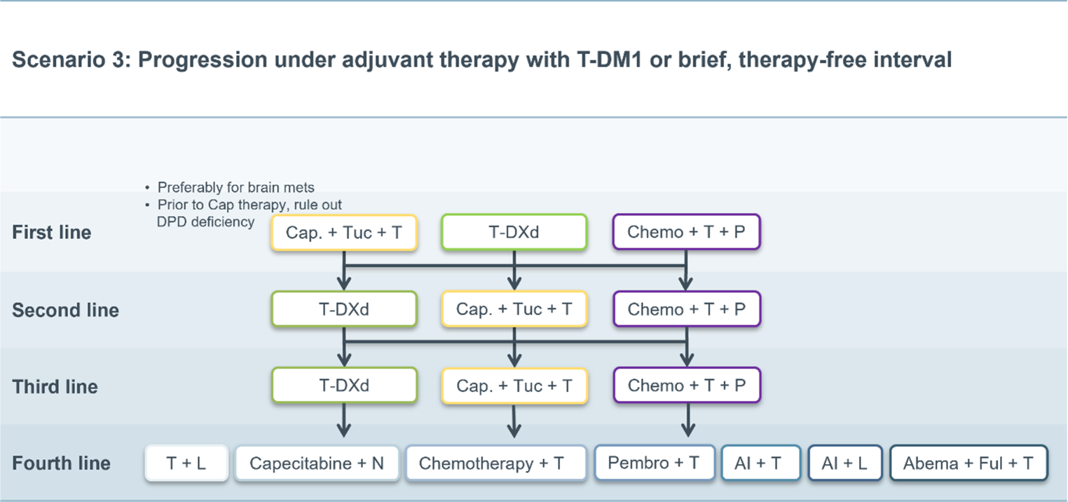 After second-line therapy (or third-line therapy if a rechallenge with trastuzumab + pertuzumab + chemotherapy was deemed appropriate), all therapeutic options described in the standard scenario subsequently move up by one line.