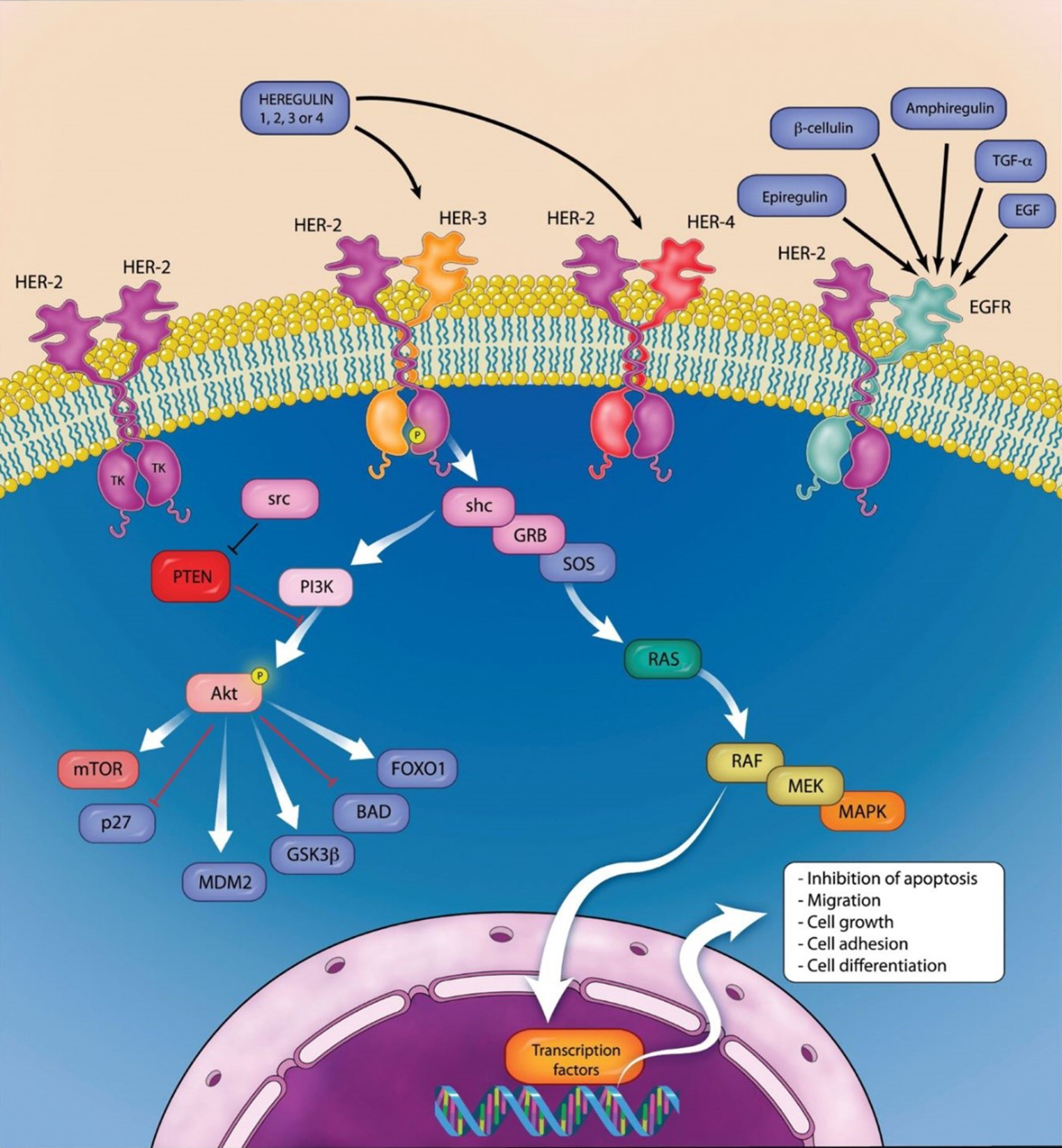 Yarden Y, Sliwkowski MX. Untangling the ErbB signalling network. Nat Rev Mol Cell Biol. 2001;2(2):127–37.PubMedCrossRef
