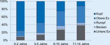 Bei den leichten Verletzungen weist der Kopf mit 41 % den größten Anteil auf, bei den schweren die oberen Extremitäten mit einem Anteil von 60 %. Je jünger ein Kind ist, desto häufiger ist der Kopf betroffen (Abb. 5).