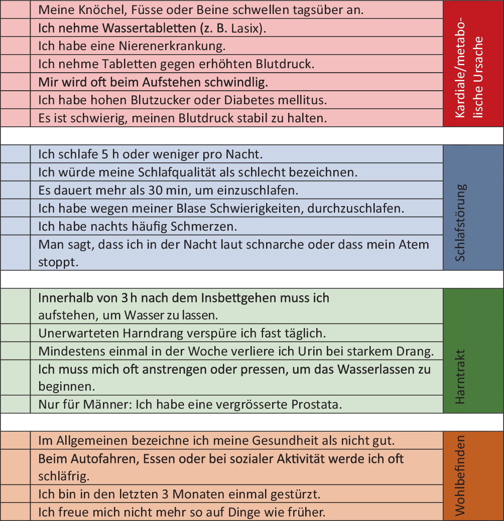 Ebenfalls hilfreich bei der Anamneseerhebung sind nykturiespezifische Fragebögen. Hier steht u. a. der International Consultation on Incontinence Questionnaire Nocturia Quality of Life Module (ICIQ-Nqol) zur Verfügung der v. a. den Einfluss auf die Lebensqualität dokumentiert (Tab. 5). Als Screeningtool zur Differenzierung der verschiedenen Ursachen kann der TANGO(Targeting the individuals Aetiology of Nocturia to Guide Outcome)-Fragebogen herangezogen werden ([4, 10]; Abb. 1).