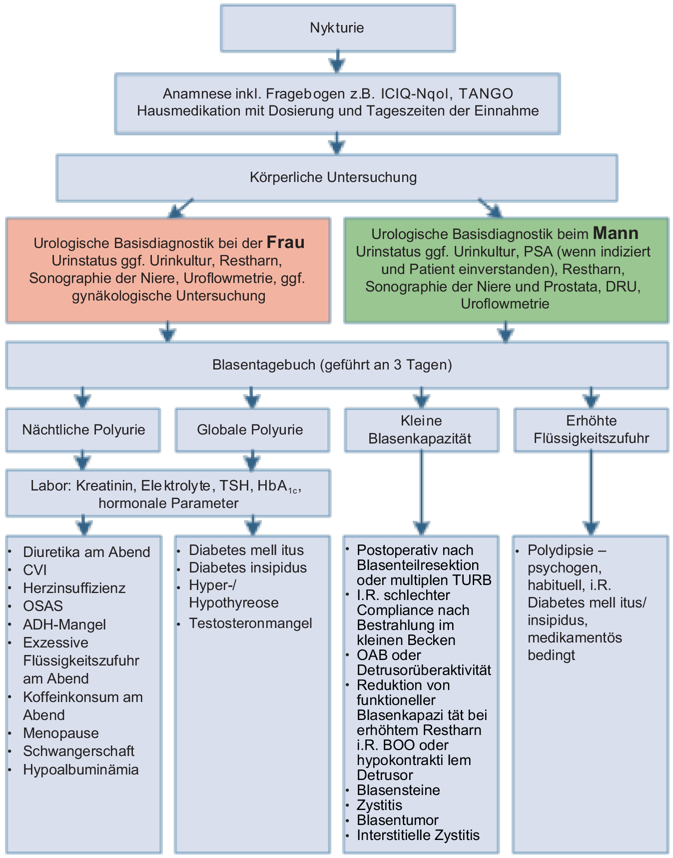Weiterer und fast schon entscheidender Bestandteil der Basisdiagnostik ist das Führen eines Blasentagebuchs. Jeder Patient sollte über 3 Tage Trink- und Miktionsverhalten (Frequenz und Menge der Miktion) dokumentieren. Sinnvoll ist es ebenfalls, die Drangsymptomatik sowie Inkontinenzepisoden zu erfassen. Basierend auf der Auswertung eines Blasentagebuchs kann dann zwischen einer globalen Polyurie (Urinausscheidung > 40 ml/kgKG), einer nächtlichen Polyurie und einer verminderten Blasenkapazität unterschieden werden. Gleichermassen spielt das Blasentagebuch in der Beurteilung des Therapieerfolgs bei Nykturie eine zentrale Rolle.