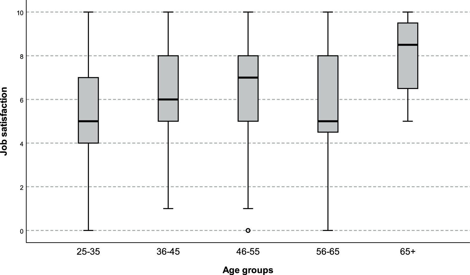 Another interesting finding is the relatively low level (and a wide range) of job satisfaction in the age group 55–65 years. This may be interpreted as a kind of end of career dissatisfaction and the lack of positive future visions for many colleagues. In contrast, the clearly higher satisfaction level (and a narrow range) in the age group 65+years may be a hint that pediatricians voluntarily staying in their job over the age of 65 years are those who are primarily more satisfied and thus continue working. The finding that this age group worked significantly less often more than 40 working hours per week than all the other age groups might be a factor contributing to higher job satisfaction since we could show a clear overall association between less workload and higher job satisfaction. Interestingly, job satisfaction was higher in pediatricians older than 65 years regardless of workplace, however, sample size was low.